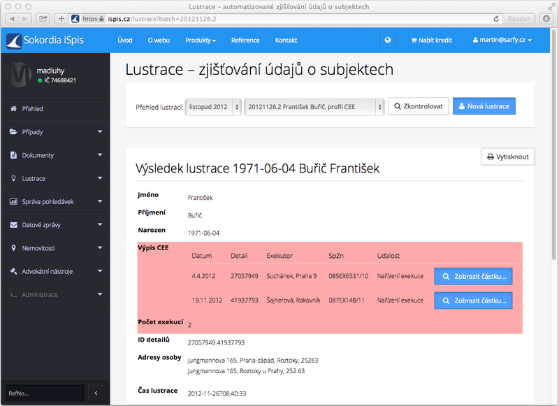 3. Po zadání osoby nebo osob k lustraci je z Vašeho účtu stržena částka za dotaz. Dle exekučního řádu je zpoplatněna i informace, že osoba nemá vedenou žádnou pravomocnou exekuci.